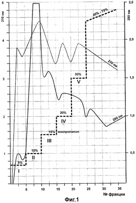 На фиг.1 представлена первая стадия очистки – хроматограмма элюции препарата с гидрофобного сорбента Полихром.