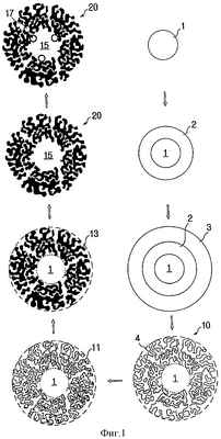 В начале готовят сферическую кварцевую сердцевину 1. Она может быть изготовлена согласно хорошо известному способу Стобера (Стобер В., Финк А., Бон Е. J. Colloid Inter. Sci. 1968, 26, 62) из предшественника (или «источника» – Прим. Перев.) кварца, такого, например, как тетраметилортосиликат и тетраэтилортосиликат. Предпочтительно, чтобы кварцевая сердцевина имела диаметр от 5 до 1000 нм.