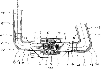 На фиг.1 схематично изображен типовой осевой насос с входным коленом 12 и выходным коленом 13. Входное колено 12 прикреплено при помощи входного патрубка 28 к входной зоне 10 цилиндрического полого корпуса 1. Выходное колено 13 прикреплено при помощи выходного патрубка 29 к выходной зоне 11 цилиндрического полого корпуса 1. В цилиндрическом полом корпусе 1 находятся, если смотреть по ходу потока, неподвижное входное направляющее устройство 6 с направляющими лопастями 9, установленный с помощью подвески нагнетающий элемент 2, состоящий из ротора 4 двигателя, лопасти 5 ротора и опорное кольцо 30. После ротора 4 двигателя, если смотреть по ходу потока, расположено неподвижное выходное направляющее устройство 7 с выходными направляющими лопастями 16. Ротор 4 двигателя приводится во вращение статором 3 двигателя, расположенным в кожухе 8 насоса. В показанном здесь в качестве примера осевом насосе на выходном колене 13 предусмотрен диффузор 25 потока. Транспортируемая кровь поступает через входной канал 18 во входной цилиндр 20 входного колена 12, где поток крови изменяет направление в соответствии с изгибом 24 входного колена и отклоняется на угол 15 входного изгиба, и затем проходит во входной патрубок 28. Поперечное сечение входного колена 12 непрерывно сужается по ходу потока вплоть до входной зоны 10. Затем кровь проходит через входное направляющее устройство 6, мимо ротора 4 двигателя и через выходное направляющее устройство 7 в выходную зону 11 цилиндрического полого корпуса 1. Далее кровь поступает в выходной патрубок 29 выходного колена 13, и в выходном колене 13 поток крови изменяет направление, отклоняясь на угол 14 выходного изгиба. Здесь тоже предусмотрено сужение поперечного сечения выходного колена 13. В данном примере выходной цилиндр 19 выходного колена 13 присоединен к диффузору 25 потока, поперечное сечение которого непрерывно увеличивается по ходу потока в направлении к выходному каналу 17. Благодаря наличию входного колена 12, которое поворачивает поток крови на угол 15 изгиба, и выходного колена 13, которое поворачивает поток крови на угол 14 изгиба, достигается невозмущенное протекание потока.