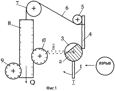 Гибкая тяга 6 изготовлена из горючего материала (пенька, капрон, лавсан и пр.) и под воздействием высокой температуры при пожаре обрывается. В результате чего устройство автоматически срабатывает при пожаре, также как и при взрыве.