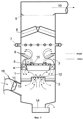 После газораспределительной диафрагмы частично очищенные газы поступают в вихревую нишу, где в каналах завихрителя происходит процесс инверсии фаз, в результате которого улавливаются наиболее тонкие фракции пыли. Насыщенные влагой газы освобождаются от загрязненной воды в водоотражающем карнизе (6) и дополнительно промываются водой из плоскофакельных форсунок (7). После полного удаления капельной влаги в капле-уловителе (8) очищенные газы поступают в газоход (10). Уловленная зола в виде пульпы удаляется через гидрозатвор (14).