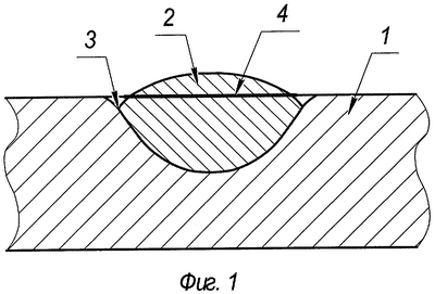 На фиг.1 представлен участок детали с устраненным дефектом до применения предлагаемого способа, где: 1 – основной металл, 2 – металл наплавки, 3 – образовавшееся занижение, 4 – чистовая поверхность.