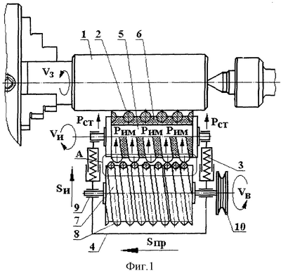 Предлагаемое устройство реализует способ чистовой и упрочняющей обработки цилиндрических поверхностей 1 специальным деформирующим элементом 2 методом поверхностного пластического деформирования. Для чего деформирующий элемент прижимают к обрабатываемой поверхности с определенным усилием Рст, т.е. создают натяг путем поперечного перемещения и сообщают продольную подачу Sпр, а заготовке сообщают вращательное движение Vз.