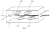 Далее подвергнутую предварительной обработке указанным выше способом трубу «t» пропускают через секцию нанесения металлического покрытия 2, внутреннее устройство которой схематически изображено на фиг.3. В состав этой секции входят, например, четыре челнока 231, 232, 233 и 234, предназначенные для обработки поверхности полимерной трубы «t» пламенем, которые для более равномерного нанесения металлического покрытия располагаются под углом 90° по отношению друг к другу. Челноки могут быть также смонтированы на подшипниках, благодаря чему в процессе нанесения металлического покрытия они могут вращаться вокруг трубы «t». Челноки нагревают посредством электрического тока, в результате чего происходит испарение используемого для получения покрытия металла, например алюминия или меди, его переход в паровую фазу и последующее осаждение на поверхности трубы «t». Секцию нанесения металлического покрытия 2 предпочтительно эксплуатируют при пониженном внутреннем давлении. Благодаря высокой гладкости поверхности трубы «t» отсутствует необходимость в дорогостоящей герметизации внутреннего объема секции 2.