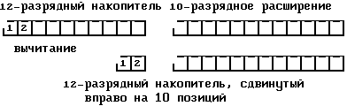 Положение разрядов 12-разрядного накопителя 42 показано в блоке 44 после сдвига назад (направо) на 10 позиций, что соответствует делению на 1024. Два его старших двоичных разряда перекрывают два его младших двоичных разряда и должны вычитаться. Это достигается изменением приращения, формируемого согласно таблице.