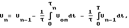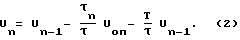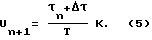 В дальнейшем каждый из трех последовательных тактов работы преобразователя будут аналогичным соответственно первому, второму и третьему тактам. Эту последовательность тактов будем называть циклом. Длительность импульса на выходе источника ШИМ-сигнала 1 в первом такте n-го цикла мы обозначим n, а во вторых и третьих тактах циклов длительность импульса не имеет значения, так как не влияет на работу преобразователя. Напряжение на выходе устройства в конце n-го цикла обозначим Un.
