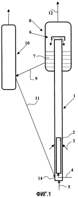 На фиг.1 в качестве примера схематически изображена традиционная установка FCC, в которой в направлении циркуляции катализатора расположен стояк (1), в основание которого подают восстановленный катализатор по трубе (11), и в верхней части которого находится система разделения газ/твердое вещество (6) любого типа, известного специалисту, от простого баллистического сепаратора (separateur balistique), принцип работы которого основан на столкновении смеси газ/твердое вещество с мишенью, и до более сложных систем, таких как сепараторы циклонного типа, непосредственно соединенные с верхней оконечностью стояка, или особые системы, обеспечивающие быстрое инерциальное разделение полученных паров и катализатора, действие которых также основано на приведении во вращение суспензии газ/твердое вещество и описание которых содержится, например, в патентах ЕР-А-0852963 и ЕР-А-1017762. В рамках настоящего изобретения стояком называется аксиально симметричная камера вытянутой по вертикальной оси формы, которая может иметь или не иметь разные сечения. Стояк (1) имеет нижнюю закрытую оконечность (17) и верхнюю открытую оконечность (18), которая может сообщаться с системой разделения газ/твердое вещество (6), находящейся в камере разделения и отгонки (8).