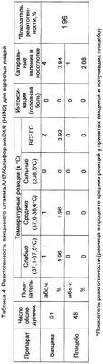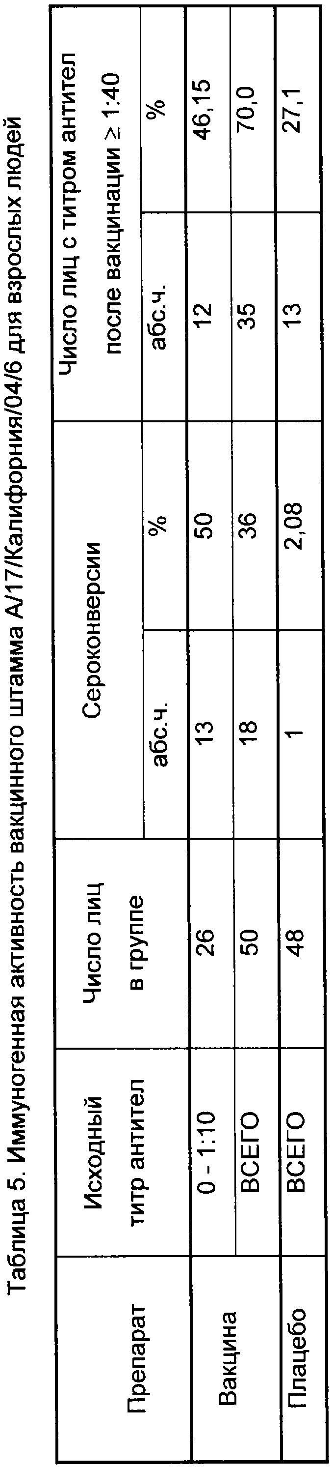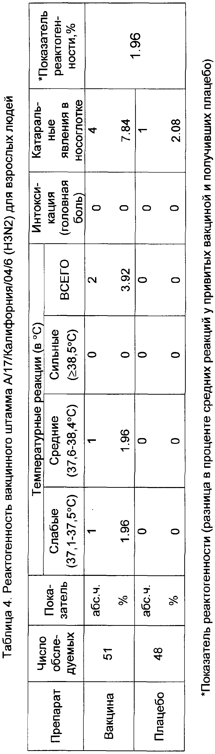 Пример 1. При вакцинации 51 взрослого человека интраназально реассортантным вакцинным штаммом А/17/Калифорния/04/6 (H3N2) с инфекционной активностью 7,5 Ig ЭИД50/0,2 мл в разведении 1:2 в объеме 0,5 мл сильных температурных реакций с повышением температуры свыше 38,5°С не наблюдалось. Слабые температурные реакции (до 37,5°С) наблюдались в 1,96% случаев. Средние температурные реакции с кратковременным повышением температуры в диапозоне 37,6-38,5°С наблюдались также в 1,96% случаев. Катаральные явления отмечены в 7,84% случаев. Результаты обследования приведены в таблице 4.