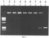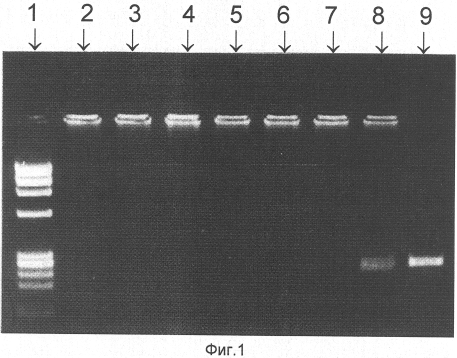 На фиг.1 представлен ПЦР-рестрикционный анализ ДНК-фрагментов М2 гена А/Ленинград/134/17/57 (H2N2), А/Ленинград/134/17/К7/57 (H2N2) и его «дикого» предшественника – вируса А/Ленинград/134/57 (H2N2). 1-я дорожка – ДНК маркер молекулярного веса IX; 2-я, 4-я и 6-я дорожки – А/Ленинград/134/57 (H2N2); 3-я, 5-я и 7-я дорожки – клон А/Ленинград/134/17/К7/57 (H2N2); 8-я дорожка – неклонированный донор аттенуации А/Ленинград/134/17/57 (H2N2), 9-я дорожка-донор аттенуации А/Ленинград/134/47/57 (H2N2). Видно, что обработанная рестриктазой Fok I ДНК-копия М2 гена вируса А/Ленинград/134/17/57 (H2N2) имеет дополнительную полосу, характерную для «дикого» вируса А/Ленинград/134/57 (H2N2) (8-я дорожка), что подтверждает данные литературы о гетерогенности неклонированного донора в этой позиции М2 гена.