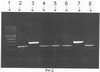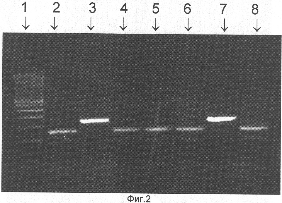 На фиг.2 в качестве примера представлена рестрикция ДНК-копии фрагмента гена РВ2 эндонуклеазой Mse I. 1-я дорожка – ДНК маркер молекулярного веса; 2-я, 5-я и 8-я дорожки – донор аттенуации; 3-я и 7-я дорожки – эпидемический вирус А/Калифорния/7/04 (H3N2); 4-я и 6-я дорожки – кандидат в вакцинные штаммы А/17/Калифорния/04/6 (H3N2). В РВ2 гене донора аттенуации в позиции нуклеотида 1459 имеется замена G T по сравнению с современными эпидемическими штаммами, приведшая к аминокислотной замене валина эпидемических вирусов на лейцин у донора аттенуации. Донор аттенуации имеет на этом участке сайт рестрикции для экзогенной рестриктазы Mse I. У эпидемических вирусов этот рестрикционный сайт отсутствует. Таким образом, обработка всех исследуемых фрагментов ДНК данным ферментом приводит к разрезанию амплифицированного участка гена РВ2 длиной 240 нуклеотидов на два более мелких фрагмента (85 и 155 нуклеотидов), если он происходит от донора аттенуации. В случае РВ2 гена от эпидемического вируса расщепления не происходит.