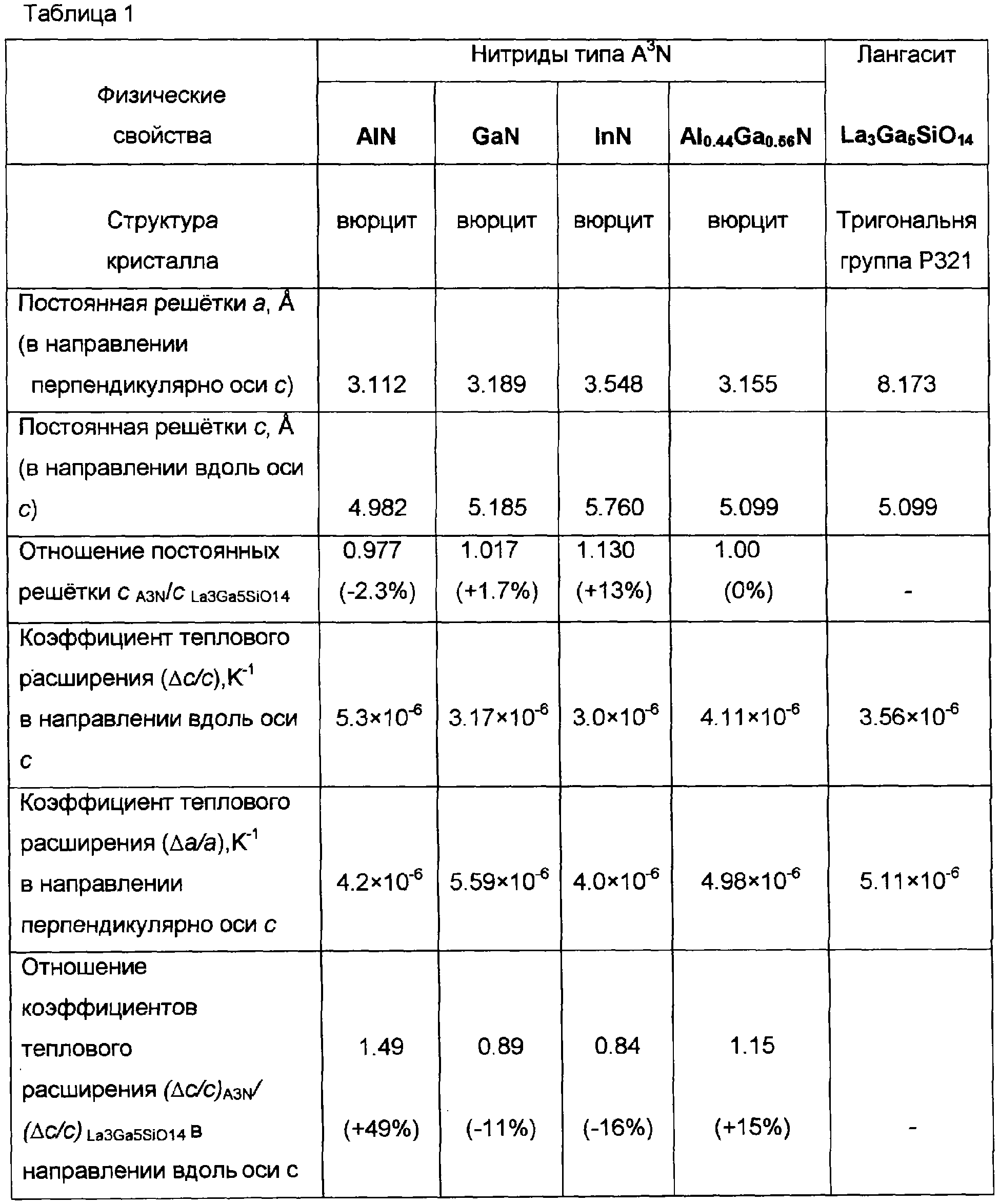 1. Метод выращивания неполярных эпитаксиальных гетероструктур для белых светоизлучающих диодов на основе соединений и твердых растворов нитридов элементов III группы, включающий газофазное осаждение одного или более слоев гетероструктур, представленных формулой AlXGa1-XN, где 0<х 1, на подложку, отличающийся тем, что в качестве подложки используют подложку а-лангасита – а-La3Ga5SiO14, с рассогласованием с-параметров решетки «подложка-эпитаксиальный слой AlXGa1-XN» не более чем в пределах от -2,3% при х=1 до +1,7% при х=0 и рассогласованием коэффициентов теплового расширения в направлении вдоль оси с не более чем в пределах от +49% при х=1 до -11% при х=0.