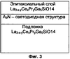 Фиг.3 представляет схематический вид светоизлучающей А3N-гетероструктуры на подложке лангасита и дополнительным слоем лангасита, легированного Се и Pr, выращенного на поверхности А3N-гетероструктуры.