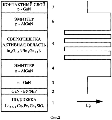 Фиг.2 представляет схематический вид светоизлучающей А3N-гетероструктуры на подложке лангасита.