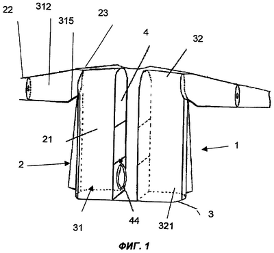 Подача воздуха в участок 21 для торса в наружном надувном корпусе 2 производится согласно изобретению отдельно от подачи воздуха в участки 22 для рукавов. В изображенном варианте подача воздуха осуществляется через участок 41 на внутренней стороне 4 боковых частей 31 и 32 внутреннего надувного корпуса 3. Участок 41 воздухопроницаем, так что воздух, поступающий во внутренний надувной корпус 3, может через этот участок попасть в участок 21 для торса в наружном надувном корпусе 2.