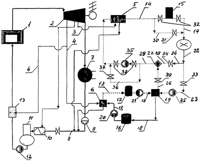 Главный насос ОСВ 35 соединен своим напорным коллектором со входом (по нагреваемой среде) штатного подогревателя 5 сетевой воды, а его всасывающий коллектор – с напорной линией 29 инжектора-смесителя 27. Главный насос ОСВ 35 используется в режимах отпуска теплоты потребителям из отборов турбины, а в часы “пик” – в режиме разрядки аккумулятора теплоты он может быть отключен. Для управления работой главного насоса ОСВ 35, его включения и выключения, он снабжен байпасным трубопроводом 36 и запорно-регулирующими задвижками 37, 38, первая из которых размещена на байпасном участке трубопровода 36, а остальные – на байпасируемом участке трубопровода.