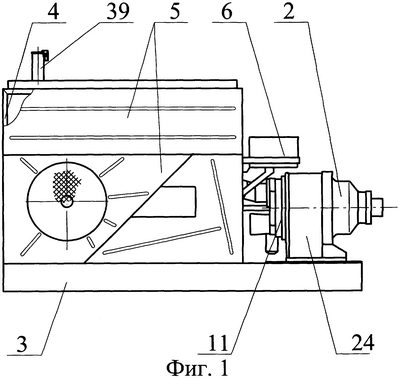 Планетарная КП установлена в цилиндрическом, снабженном торцевой крышкой корпусе, закрепленном на общей раме через полый постамент, полость которого использована в качестве масляного бака смазки КП и упомянутого шестеренчатого редуктора, а в качестве корпуса для шестеренчатого редуктора использована торцевая крышка корпуса КП.
