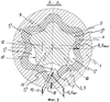 1. Статор винтовой героторной гидравлической машины, например, двигателя для вращения ротора от насосной подачи текучей среды или насоса для подачи текучей среды за счет вращения ротора, содержащий полый корпус с внутренней поверхностью, выполненной в форме геликоида по существу с внутренними винтовыми зубьями, закрепленную в полом корпусе обкладку из эластомера, прилегающую к внутренней поверхности полого корпуса, при этом обкладка выполнена с внутренними винтовыми зубьями и совпадает по форме с внутренними винтовыми зубьями в полом корпусе, отличающийся тем, что толщина обкладки из эластомера, например, из резины, является максимальной в радиально направленных наружу впадинах между внутренними винтовыми зубьями, при этом толщина вп обкладки в радиально направленных наружу впадинах между внутренними винтовыми зубьями и толщина выс обкладки на внутренних винтовых зубьях, радиально направленных внутрь, связаны соотношением: