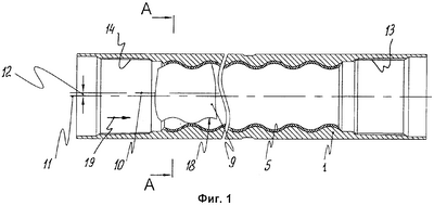 Кроме того, на фиг.2 показано: поз.17 – многозаходные винтовые камеры между зубьями 18 ротора 9 и зубьями 5 эластомерной обкладки 4; на фиг.1 показано: поз.19 – направление потока бурового раствора внутри двигателя.