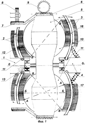 1. Фигура 1 – держатель 5 при вращении перемещается фронтально на шлицах вала 13 благодаря наличию кольца 6 на себе с резьбой, работающей в паре с, по меньшей мере, одной шестерней 9, неподвижной или управляемо «вращающейся». Штанги 12 и 16 шарнирно отклоняемы параллельно оси OO1. Пружины или торсионы 11 от валов 1,4 к штангам 12, 16, стоящим на шарнирах 17, поджимают к фрикционным шарам 10 наборы колец 2 и 3, образующих «диски» со спрямленной рабочей поверхностью.