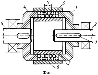 Ведущее зубчатое колесо 1 расположено на валу 2 таким образом, что возможно перемещение его по шпонке 3 вдоль оси вала 2. Ведомое колесо 4 закреплено на валу 5. Колеса 1 и 4 имеют торцовые зубья и непосредственно между собой не взаимодействуют. Передача движения осуществляется через «третье тело» 6 – набор тел качения сферической формы. Шарики 5,6 мм в количестве 250 шт, составляющие «третье тело», находятся в замкнутом пространстве между колесами и кольцами: внутренними 7 и наружными 8. Наружное кольцо 8 может быть заменено стенкой корпуса.