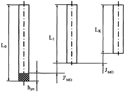 где S1, SMO – путь трения, приходящийся на изнашивание упрочненного слоя (покрытия) с превышением его толщины и материала основы образца соответственно; L0, L1, LK, hуп – размеры образца: исходный, после изнашивания с превышением толщины упрочненного слоя (hуп) и конечный, после изнашивания материала основы соответственно. Указанные обозначения иллюстрируются на чертеже.