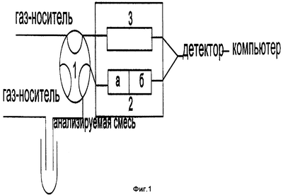 Изобретение поясняется фиг.1, где 1 – трехходовой кран; 2 – колонка, заполненная слоем а – модифицированный Haye Sep N и слоем б – Хромосорб 106; 3 – колонка сравнения.