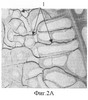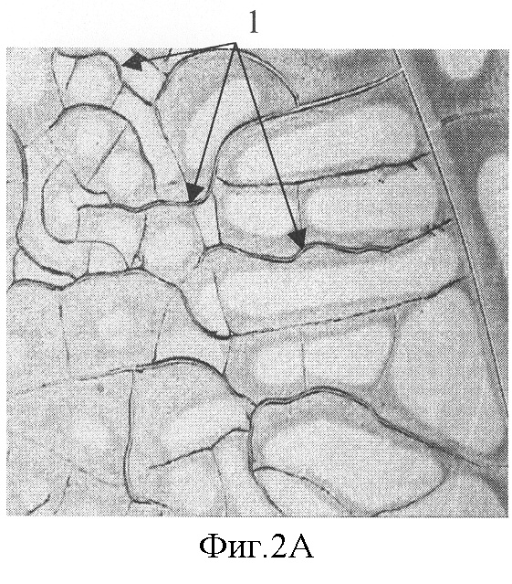 При сопоставлении результатов ЭНМГ и ЭМГ обследования и структуры фации плазмы крови оказалось, что у 90% больных, которым был поставлен диагноз паранеопластической ПНП, выявлялось сочетание двух признаков – волнообразных трещин в центральной зоне фации и морщин в периферической зоне фации. На фиг.2 представлена микрофотография фации плазмы крови больной К. (увеличение ×40), 2А – волнообразные трещины в центральной зоне фации (указаны стрелками 1) и 2Б – морщины в периферической зоне фации (указаны стрелками 2).