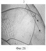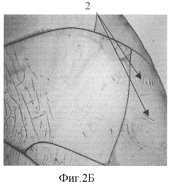 На фиг.2 представлена микрофотография (увеличение ×40) фации плазмы крови больной раком молочной железы с паранеопластической полинеропатией, 2А – волнообразные трещины в центральной зоне фации (указаны стрелками 1) и 2Б – морщины в периферической зоне фации (указаны стрелками 2).
