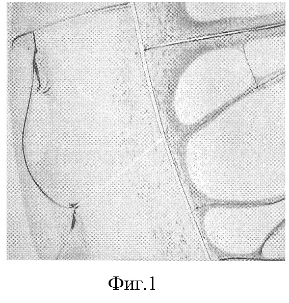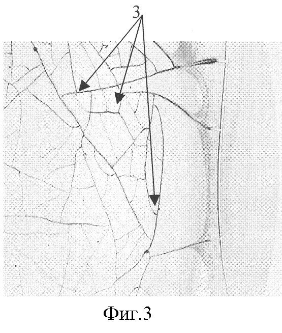 При исследовании плазмы крови методом клиновидной дегидратации: в периферической зоне фации присутствовали трещины, параллельные краю, а в центральной зоне – прямые трещины образовывали беспорядочную сеть, волнообразных трещин в центральной зоне фации и морщин в периферической зоне фации не выявлялось. Микрофотография (увеличение ×40) фации плазмы крови представлена на фиг.3, где показана сеть прямых трещин (указаны стрелками 3).