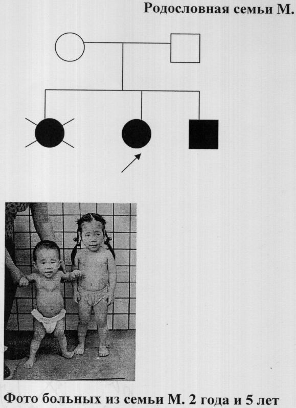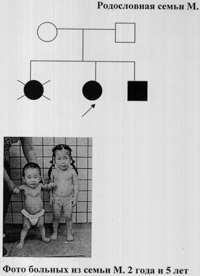 Из родословной: Беременность-1 завершилась мертворожденным плодом женского пола, с весом – 1700 и гидроцефальной формой головы. Сибс с таким же фенотипом.
