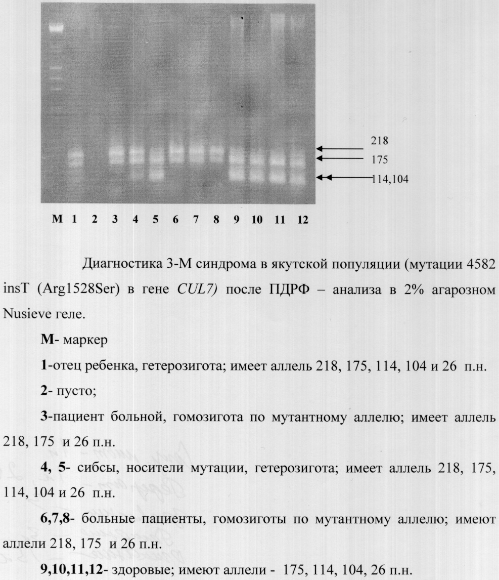Быстрый способ диагностики 3-М синдрома испытан на 39 больных с 3-М синдромом, 35 их родственниках и 20 здоровых индивидах якутской национальности. Все больные были гомозиготами по данной мутации и имели аллели длиной 218 п.н. и 175, 26 п.н., 30 родственников из 35 были гетерозиготными носителями мутации и имели длины фрагментов 218, 175, 114, 104 и 26 п.н., остальные 5 из группы родственников и 20 здоровых имели фрагменты длиной 175, 114, 104, 26 п.н. Чертеж.