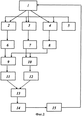 На фиг.2 представлено устройство, реализующее данную систему. Оно содержит: энерготехнологический объект управления 1; блоки определения: расходов энергоносителей 2, сквозных энергозатрат 3 и производительности 4; блок задатчика времени приращений расходов энергоносителей, сквозных энергозатрат и производительности 5; блоки приращений: расходов энергоносителей 6, сквозных энергозатрат 7 и производительности 8; блок динамической энергоемкости по расходам энергоносителей 9; блок динамической энергоемкости по сквозным энергозатратам 10; блок оценки объекта управления по расходам энергоносителей 11, блок оценки объекта управления по сквозным энергозатратам 12, блок монитора-советчика оператора 13, блок управления оператора 14 и блок автоматизированного управления объектом 15.