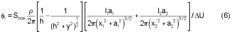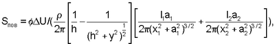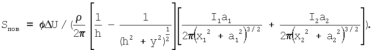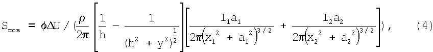 Способ определения наличия и площади эквивалентного повреждения в изоляционном покрытии подземного сооружения, включающий измерение с помощью двух электродов сравнения падения напряжения U в грунте, установленных на расстоянии у по линии перпендикулярной оси трубопровода, отличающийся тем, что определяют глубину залегания оси трубопровода в месте измерения h, с поверхности земли над трубопроводом измеряют удельное электрическое сопротивление грунта с помощью четырехэлектродной схемы, располагая электроды по линии, перпендикулярной трубопроводу, определяют силу тока на выходе двух установок катодной защиты I1 и I2, между которыми производят измерения, минимальное расстояние от анодных заземлений установок катодной защиты до трубопровода a1 и а2, расстояние от места измерений до места подключения установок катодной защиты к трубопроводу x1 и x2, а площадь эквивалентного повреждения Sпов определяют по формуле