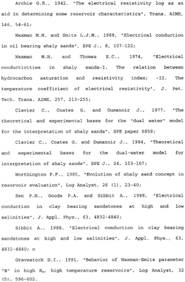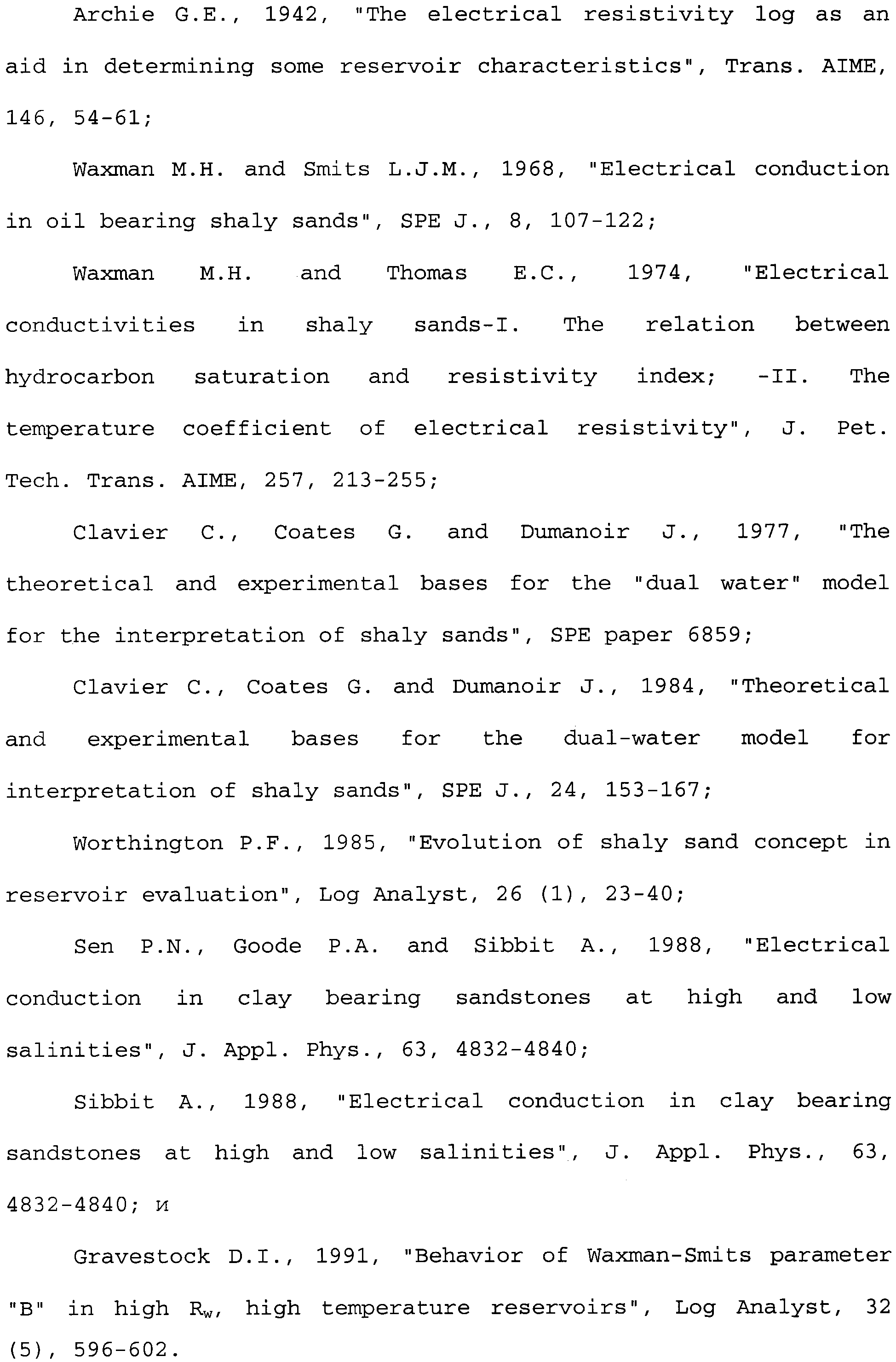 Эта модель была расширена для более полного учета влияния температуры и солености. Показатель m* был моделирован как функция корня квадратного из способности к катионному обмену, умноженная на плотность матрицы. Заявитель успешно использовал для глины среднее значение 0,1 миллиэквивалента на каждый грамм глины при демонстрации реализуемости способа и устройства согласно изобретению. Модели удельной проводимости, которые можно успешно использовать в сочетании с изобретением, включают в себя модели удельной проводимости Waxman-Smits-Thomas, Clavier-Coates-Dumanoir, Waxman-Smits-Gravestock и Sen-Goode-Sibbit. В приведенных ниже источниках, каждый из которых включен в настоящую заявку посредством ссылки, эти процедуры и их варианты рассмотрены подробно: