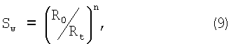 Затем оцененное электрическое удельное сопротивление заполненного водой пласта можно сравнить с результатами измерений электрического удельного сопротивления пласта в процессе 58 различения насыщения водой и насыщения углеводородами. В случае, если Rt представляет собой электрическое удельное сопротивление, измеренное зондом с большим радиусом исследования, а R0 – ожидаемое электрическое удельное сопротивление пласта, заполненного минеральным раствором, то насыщение Sw водой может быть аппроксимировано как