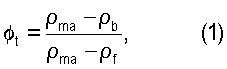 Результаты измерений объемной плотности при гамма-гамма-каротаже (выходной сигнал устройства 24 плотностного каротажа, рассмотренного выше) обычно преобразуют в значения “пористости по данным плотностного каротажа” во время или сразу же после каротажа. Уравнение, связывающее объемную плотность и пористость, имеет вид