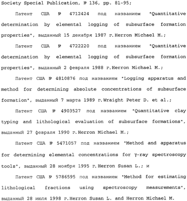 Измерения могут проводиться во время единственного прохода кабельного каротажного устройства или во время бурения, как рассматривалось выше, или в различные периоды времени. Например, данные каротажа необсаженного ствола скважины комплексным кабельным зондом тройного назначения можно обрабатывать вместе с полученными позднее спектроскопическими данными кабельного каротажа обсаженного ствола скважины, используя способ согласно изобретению.