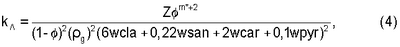 Проницаемость пласта может быть определена при использовании этих фракционных литологических значений для пласта и скорректированных значений общей пористости (рассмотренных выше) в процессе 52 вычисления проницаемости. В ходе этого процесса вычисляют проницаемость в кремнисто-обломочных и родственных пластах на основе параметра лямбда. Параметр лямбда представляет собой меру эффективного диаметра динамически связанных пор и в случае простейших геометрий пор может быть аппроксимирован на основании отношения поверхности порового пространства к объему порового пространства. Было показано, что отношение поверхности порового пространства к объему порового пространства может быть вычислено на основании данных минералогии или по литологическим концентрациям. К числу других необходимых входных данных относятся общая пористость, плотность матрицы и показатель сцементированности Арчи, m*. В более сложных системах пор при меньшей проницаемости некоторые из пор становятся в потоке неэффективными, а первоначально предсказанные проницаемости слишком высокими, но могут быть безошибочно снижены. Первоначальная k-лямбда оценка, примененная к данным литологии, имеет вид:
