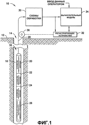 На фиг.1 показано устройство, предназначенное для петрофизической оценки подземного пласта в соответствии с некоторыми вариантами осуществления изобретения. Система 10 сбора и обработки данных показана развернутой внутри подземного пласта 12. Ствол 14 скважины пробурен внутри подземного пласта 12 и заполнен буровым раствором 16. Каротажный прибор 18 подвешен в стволе 14 скважины на бронированном кабеле 28, выпущенная длина которого по существу определяет глубину погружения каротажного прибора внутри подземного пласта 12. Длину кабеля регулируют посредством обычного средства на поверхности (непоказанного). В этом конкретном варианте осуществления устройства согласно изобретению каротажный прибор 18 включает в себя устройство 20 спектроскопического каротажа, устройство 22 нейтронного каротажа, устройство 24 плотностного каротажа и устройство 26 для измерения электрического удельного сопротивления. Устройством спектроскопического каротажа может быть, например, зонд ECS спектроскопического каротажа по спектру захвата фирмы Schlumberger, а устройство 22 нейтронного каротажа, устройство 24 плотностного каротажа и устройство 26 для измерения сопротивления могут быть составными частями комплексного каротажного зонда тройного назначения PLATFORM EXPRESS фирмы Schlumberger. Устройство 20 спектроскопического каротажа обеспечивает получение количественного показателя состава пласта посредством измерения абсолютных и относительных концентраций большого количества элементов, таких как кремний, кальций, железо и сера. К тому же эти концентрации элементов также могут быть использованы для оценки абсолютных или относительных весовых долей литологических материалов, таких как глина, песчаник, карбонаты и пирит. В устройстве 26 для измерения электрического удельного сопротивления могут использоваться, например, принципы бокового электрического каротажа с фокусировкой тока или измерения индуктивного сопротивления. Дополнительное устройство, которое не показано, может быть использовано для определения температурного профиля пласта. Схемы 30, которые показаны на поверхности, хотя часть их может быть размещена в стволе скважины, представляют собой схемы обработки данных, поступающих от различных составных частей каротажного прибора 18. Желобчатое колесо 36 может быть предусмотрено для определения глубины погружения каротажного прибора 18, а сигналы с него обычно подаются на регистрирующее устройство 32, которое основано на принципах электрической, магнитной, оптической, графической записи и/или на иных принципах хранения и регистрации сигналов, принятых от схем 30 обработки и вычислительного модуля 34.