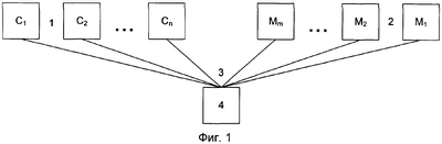 Система содержит стационарные контрольные посты 1 (C1…Cn), мобильные контрольные посты 2 (М1…Мm), прямые и обратные связи 3, диспетчерский центр 4.