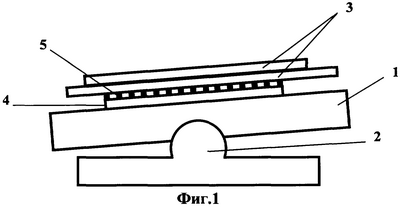 Соединение двух полированных, прозрачных пластин 3, скользящих друг по другу, в выравнивающем элементе, может осуществляться различными способами. В нашем примере верхняя пластина выравнивающего элемента 3 свободно расположена на нижней пластине выравнивающего элемента 3. Но возможны варианты, когда верхняя пластина выравнивающего элемента удерживается на центральной части нижней пластины выравнивающего элемента пружинным фиксатором, который не мешают полированным, прозрачным пластинам выравнивающего элемента скользить друг по другу. Установка выравнивающего элемента 3 на контакты в виде выступов 5 нижней подложки 4 также может быть осуществлена различными способами – с помощью какого-либо подающего устройства, рычага и т.п., которые мы не показываем на фиг.2.