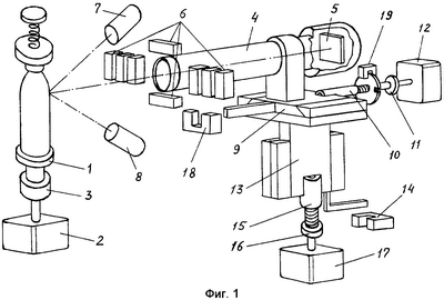 Исследуемый объект устанавливают на объектодержатель 1. Далее с помощью шагового двигателя 12, который вращает винтовую пару 10 через муфту 11, каретку фокусировки 9 перемещают в исходное состояние, что автоматически контролируется по датчикам грубого 18 и точного 19 позиционирования.