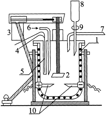 1 – реактор с нагревателем, 2 – мешалка, 3 – электродвигатель мешалки, 4 – регулировка термопары, 5 – термопара, 6 – трубка ввода газа (аргона), 7 – трубка вывода газа (аргона), 8 – емкость с раствором металлсодержащего соединения, 9 – дозатор металлсодержащего соединения, 10 – электроды высоковольтной импульсной установки.
