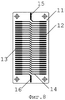 На фиг.8 обозначено: 11 – прямоугольная диэлектрическая плата; 12 и 13 – основные контактные площадки, с которыми соединяются начала и концы проводов ленточной линии 1; 14 – проводники, соединяющие контактные площадки 12 и 13 со сдвигом на один шаг; 15 и 16 – дополнительные контактные площадки, к которым подсоединяются вторые концы электрического шнура 5.