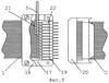 На фиг.9 обозначено: 17 и 18 – основание и крышка прямоугольной диэлектрической коробки, входящей во второй вариант катушки индуктивности; 19 и 20 – вилочная и розеточная части плоского разъема; 21 – диэлектрическая трубка, надетая поверх места соединения одного из вторых концов двухпроводного электрического шнура 5 и конца первого провода ленточной линии 1; 22 – диэлектрическая трубка, надетая поверх места соединения конца третьего провода ленточной линии 1 со вторым контактом вилочной части 19 плоского разъема. Число таких трубок равно числу контактов плоского разъема. Слой клеящего вещества, закрепляющего конечную часть ленточной линии 1 и вилочной части 19 плоского разъема на основании 17 прямоугольной диэлектрической коробки, на фиг.9 не показан.