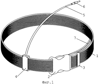 Гнездовая часть 2 пряжки-защелки содержит одну щель, штыревая часть 3 – две щели. Часть ленточной линии 1 выведена с лицевой стороны пряжки-защелки на ее тыльную сторону, сложена в виде одной бифилярной петли 7 и прижата к участку ленточной линии 1, находящемуся возле штыревой части 3 пряжки-защелки.