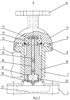 На изоляторах 4 устанавливаются контактный нож 5 с разъемным контактом в виде контактных пальцев и контактный нож 6 с входящим контактом. На другой неразъемной стороне контактных ножей 5 и 6 на продольной оси изоляторов 4 расположены контактные основания 7, в которых имеются кольцевые канавки 8, в которых находятся токоведущие элементы (ролики или шарики) 9. По продольной оси изоляторов 4 расположена неподвижно укрепленная ось 10, на которой вращается контактный вывод 11 с кольцевой канавкой 12. В контактном выводе 11 закреплен шарикоподшипник 13, а на верху контактного вывода выполнена контактная площадка 14 с отверстиями, к которой крепится подводящий провод линии электропередачи. В оси 10 выполнено сквозное отверстие 15 вдоль ее геометрической оси, совпадающей с продольной осью изолятора 4. В отверстии 15 установлена тяга 16, один конец 17 которой опирается на внутреннее кольцо шарикоподшипника 13, и, таким образом, она взаимодействует с контактным выводом 11. Второй конец 18 тяги 16 взаимодействует с контактной пружиной 19, расположенной в полости 20 оси 10, образованной расточкой отверстия 15 под размеры пружины 19.
