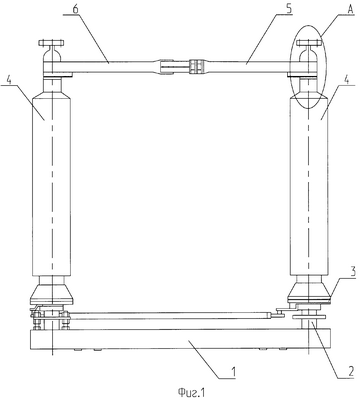 Разъединитель содержит раму 1, на которой закреплены основания 2, в которых установлены поворотные валы с плитами 3. К плитам 3 крепятся два опорных поворотных изолятора 4 (как частный случай у разъединителя на напряжения 35, 110 кВ может быть только один опорный поворотный изолятор).