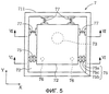 Фиг.5 показывает вариант осуществления устройства 7 управления пространственным положением, и фиг.6 показывает сечение, выполненное по линии VI-VI на фиг.5. Устройство 7 управления пространственным положением имеет раму, открытую с ее верхней стороны и образованную первым элементом 71 в виде плоской плиты и боковыми стенками 711. Данная рама может быть выполнена, например, из материала, представляющего собой аустенитную нержавеющую сталь. Второй элемент 72 в виде плоской плиты установлен между парами боковых стенок 711, 711, обращенных друг к другу, при этом вторые приводы 75, 75 расположены между вторым элементом 72 в виде плоской плиты и боковой стенкой 711. Соответствующее расстояние L предусмотрено между первым элементом 71 в виде плоской плиты и вторым элементом 72 в виде плоской плиты. Расстояние L является достаточно большим для того, чтобы предотвратить столкновение первого элемента 71 в виде плоской плиты и второго элемента 72 в виде плоской плиты друг с другом даже тогда, когда второй элемент 72 в виде плоской плиты наклонен. В проиллюстрированном варианте осуществления множество пружин 77, 77, расположено между боковой стенкой 711 и вторым элементом 72 в виде плоской плиты, как и второй привод 75, для удерживания второго элемента 72 в виде плоской плиты в плоскости X-Y.