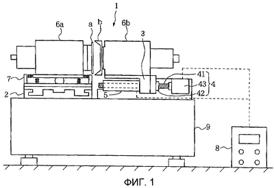 На фиг.1 показан вариант осуществления устройства 1 для прецизионной обработки. Устройство 1 для прецизионной обработки образовано главным образом вращательным устройством 6а, предназначенным для вращения предмета а, подлежащего шлифованию, в то время как предмет а удерживается в некотором пространственном положении за счет вакуумного притяжения, первой опорой 2, несущей вращательное устройство 6а, второй опорой 3, несущей вращательное устройство 6b, предназначенное для вращения шлифовального круга b, средством для регулирования перемещения, предназначенным для перемещения второй опоры 3 в горизонтальном направлении, и основанием 9, которое поддерживает снизу первую и вторую опоры 2 и 3. Предпочтительно алмазный шлифовальный круг используется в качестве шлифовального круга b на стадии чернового шлифования, и шлифовальный круг для химико-механического шлифования используется в качестве шлифовального круга b на стадии сверхпрецизионного шлифования.